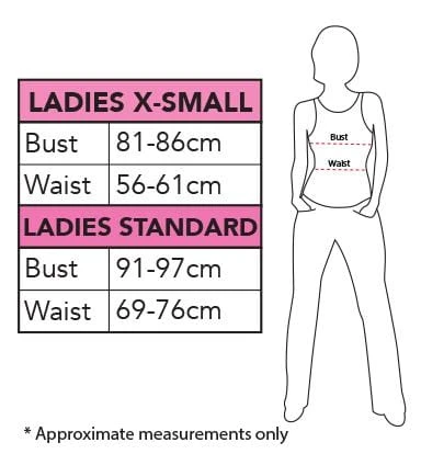 Available in Ladies XS and Standard only. XS = Aus 6-8, STD = 10-12.
