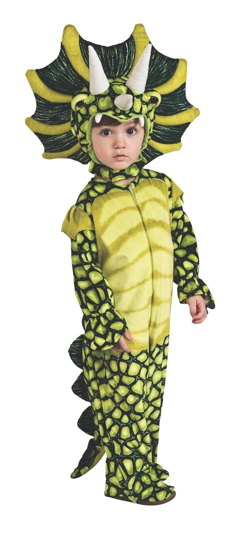 - Jumpsuit features a detachable plush head with fibre filled 3D dinosaur facial features and triceratops frill feature
