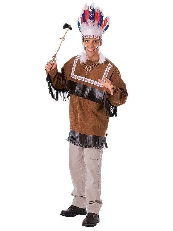 - Faux feathered headdress wraps around head and fastens with velcro tabs at rear