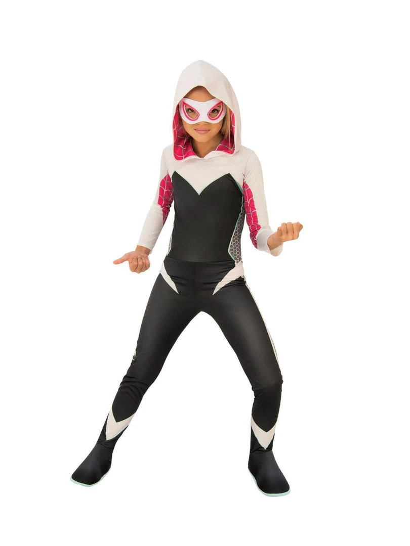 - Long sleeved jumpsuit in vinyl-like fabric with attached hood with coloured internal fabric plus printed web detail on sleeves and bodice and velcro closures at back