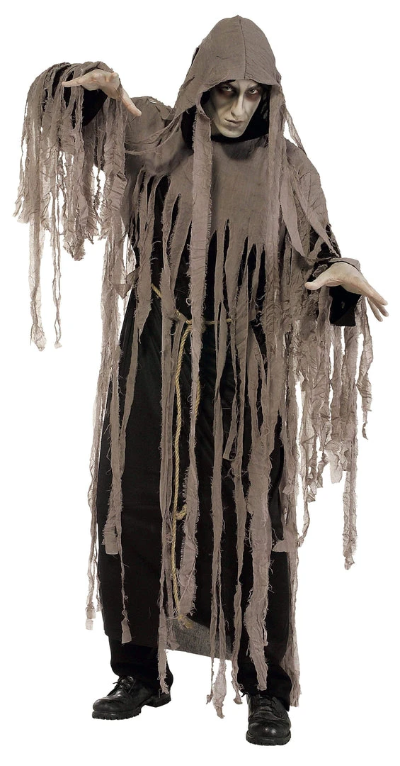 - Full length black hooded gauze robe with attached fabric pieces on arms, hood and collar