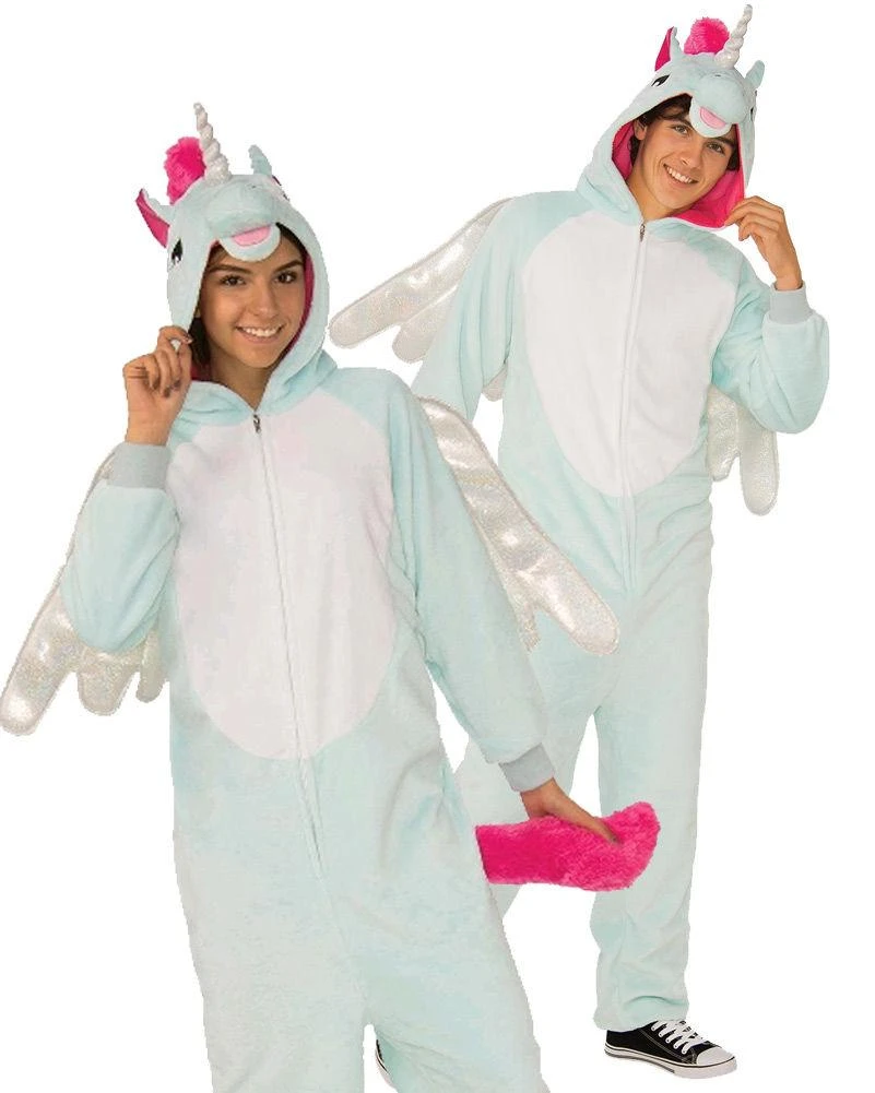 - Jumpsuit features attached hoodie with 3D ears, unicorn horn and plush mane