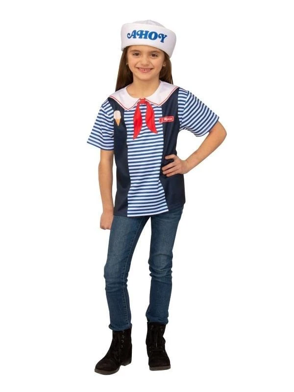 Robin Buckley, played by Maya Hawke she is fluent in three languages and good friends with fellow class-mate and colleague at Scoops Ahoy, Steve Harrington. An alternative girl, Robin is equal parts sharp and playful. Bored with her mundane day job, she just wants a little excitement in her life… and gets more than she bargained for when she uncovers a dark secret in Hawkins. Don the blue, red and white Scoops Ahoy uniform and see what unfolds.Â