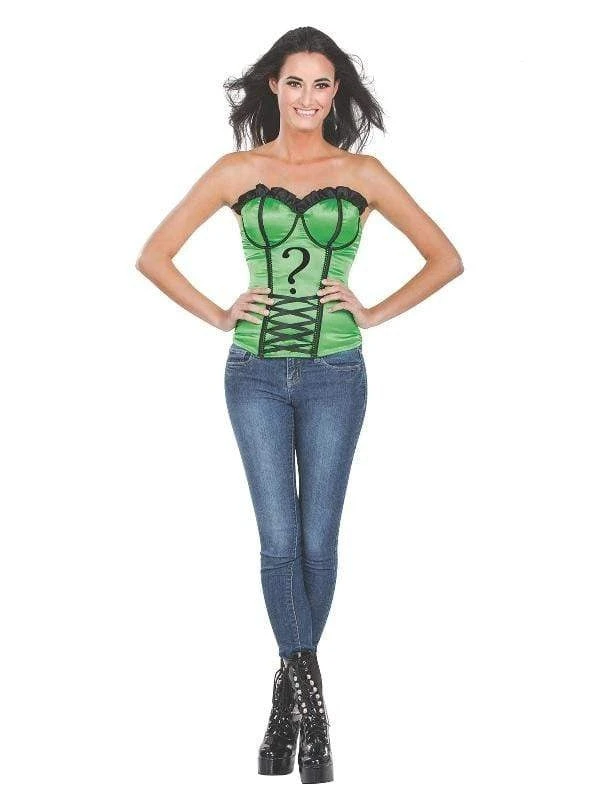 This sexy Riddler Corset is guaranteed to make you stand out at your next costume party. The elegant fit of this corset combined with the mystery of the Riddler is sure to make all other party goers green with envy. Dress this piece up with green leggings and black boots to complete the look!