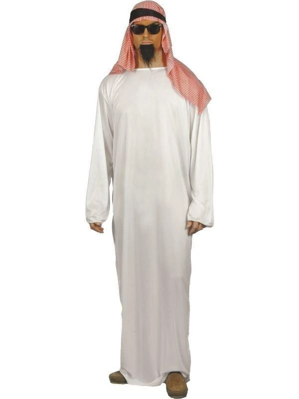 You don’t need an oil field to dress as an Arab Sheikh. This simple, effective and cheap costume is perfect for an Arabian Nights party. Costume includes white gown and red and white checked headdress. Fake goatee and dark glasses sold separately.