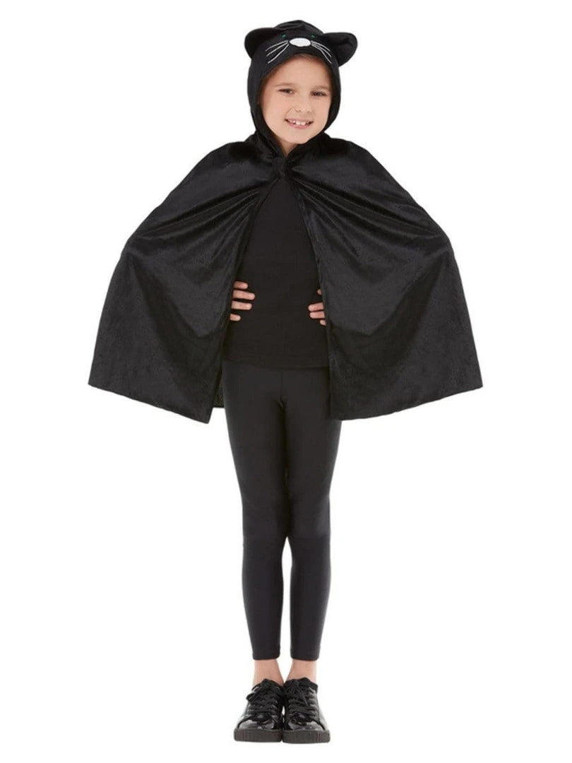 Black cat hooded cape is a soft flowing cape with attached hood with black cat ears and embroidered green eyes and white whiskers. There is a detachable black tail on the back of the cape. Perfect easy to wear costume at Halloween and Book Week. Cape only. Top and tights not included.