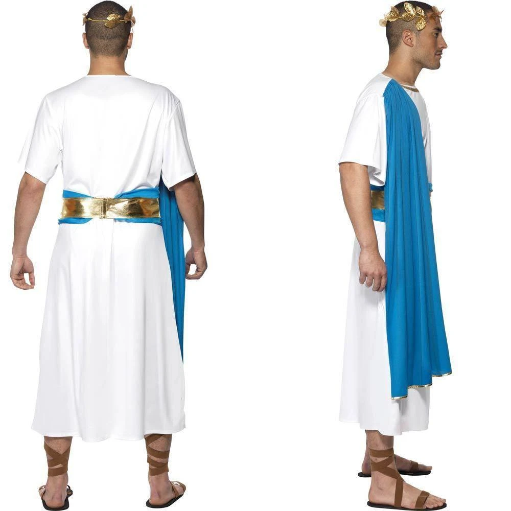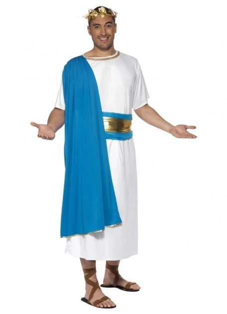 Hail Caesar! Handsome Roman toga costume in stunning white, bright blue and gold. A perfect match with our Roman Toga Costume for women. Costume includes: white gown with gold trim and blue drape, matching blue and gold belt and gold laurel headband. Roman sandals sold separately.