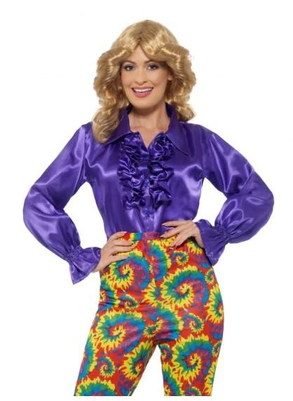 Nothing says 70s like a satin ruffle blouse. Pull on your flares, dust on some blue eyeshadow and smear on some lip gloss and you are ready to burn up the disco dance floor like it’s the 1970s. Long sleeve purple blouse with large lapels, ruffles and ruffled cuffs. Wig, pants and all other items sold separately. Perfect look for Abba, Saturday Night Fever, Charlie’s Angels, The Brady Bunch.Â