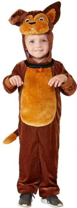 Woof woof! Cute brown dog one piece costume for toddlers. Costume is two tone brown light-weight one-piece jumpsuit with tail, attached hood with adorable puppy dog face with cute pink tongue, one floppy ear and one pointed ear and bone shaped dog tag. This soft onesie costume will look precious on your little one at Book Week, Halloween and anytime as children love to wear their costumes all year round.