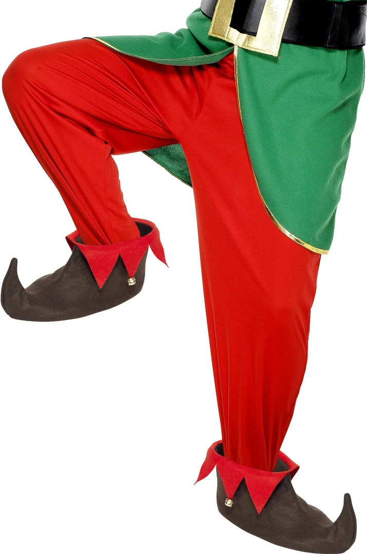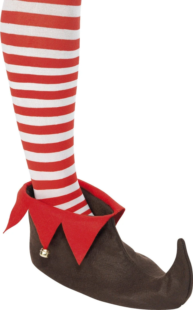 Elf shoes to complete your Santa’s Helper Christmas Elf costume or for Fairy-tale elves. Brown felt elf shoes with red trim with bells and black vinyl base. Packet contains one pair of elf shoes. Striped stockings and elf costumes sold separately.