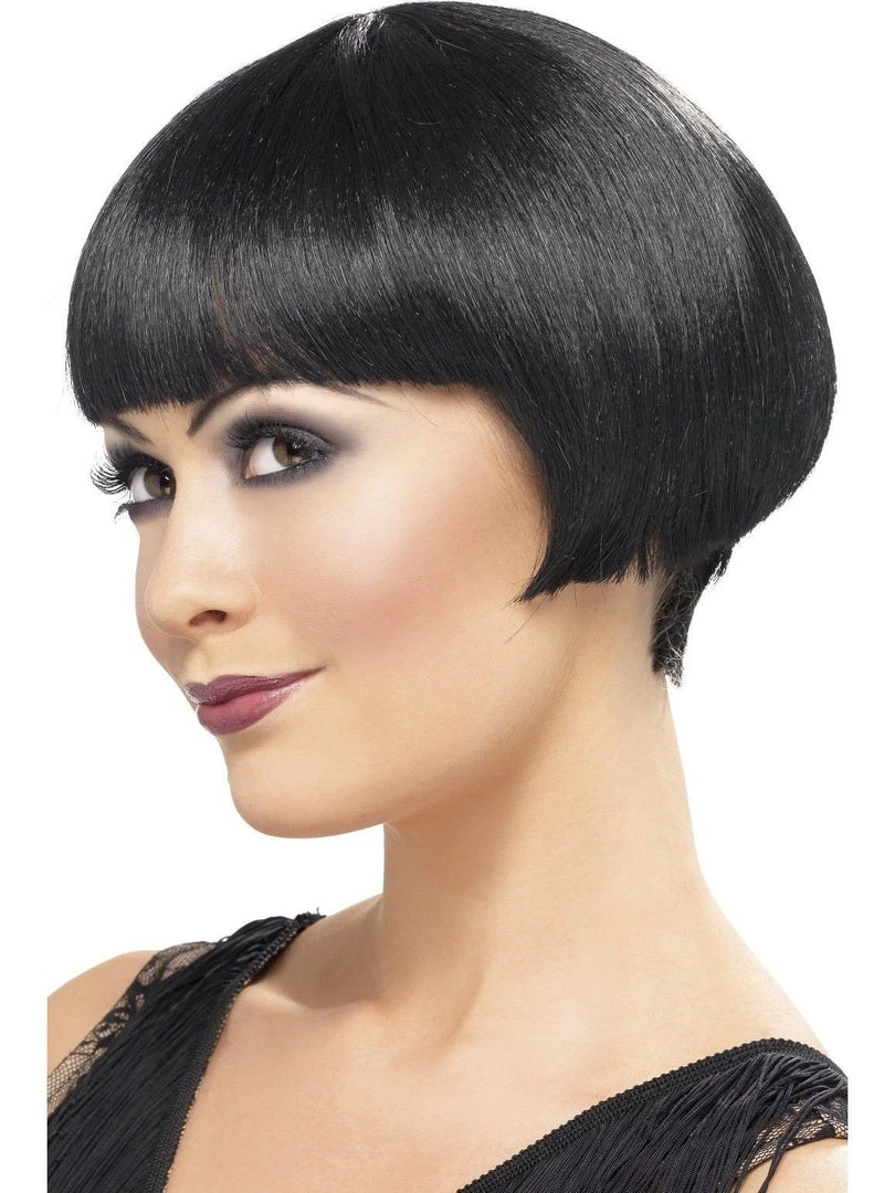 Classic 1920s Flapper style cropped black Lulu bob wig. Also great for the swinging London, Vidal Sassoon Mary Quant look of the 1960s