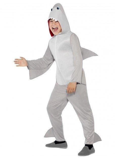 All in one shark costume for children. Jumpsuit has attached fins and hood. Dress as Jaws at Hollywood theme parties or as Bruce from Finding Nemo. Great at Book Week and Halloween and for Australia Day.
