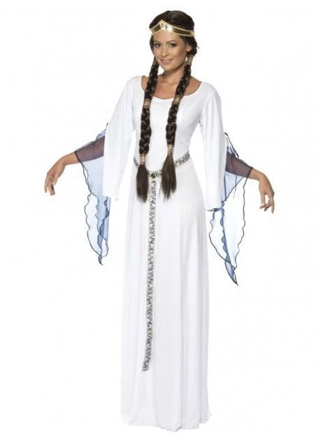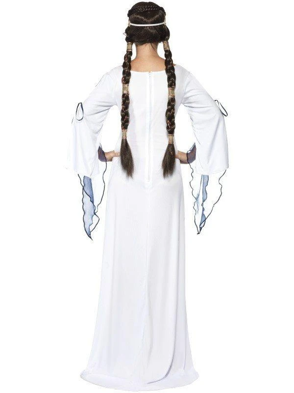 Pure and innocent Medieval Maid Costume in white. Costume is white dress with attached brocade belt and headpiece. Wigs sold separately. Great for Game of Thrones and Medieval Fairs. Also beautiful as an Angel costume. Just add a pair of our feathered Angel wings.