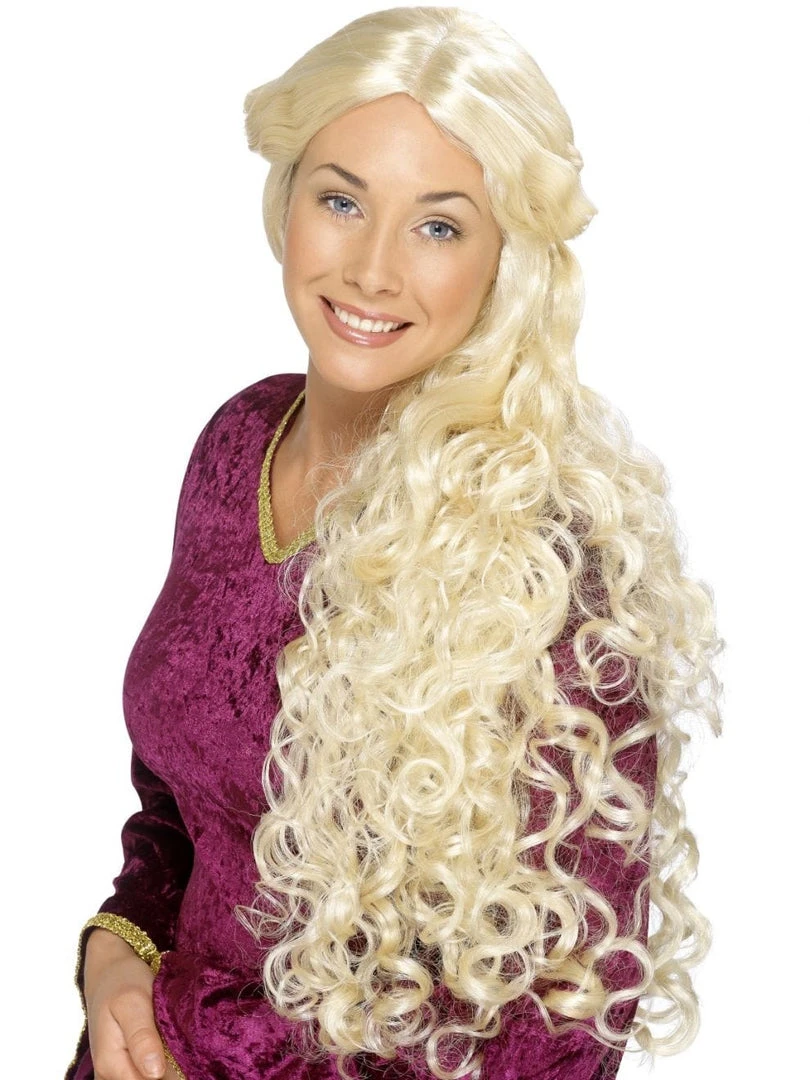 Very long, blonde wavy women’s Renaissance style wig with centre skin parting. Complete your Medieval, Renaissance or Fairy Tale princess costume with this long wig.