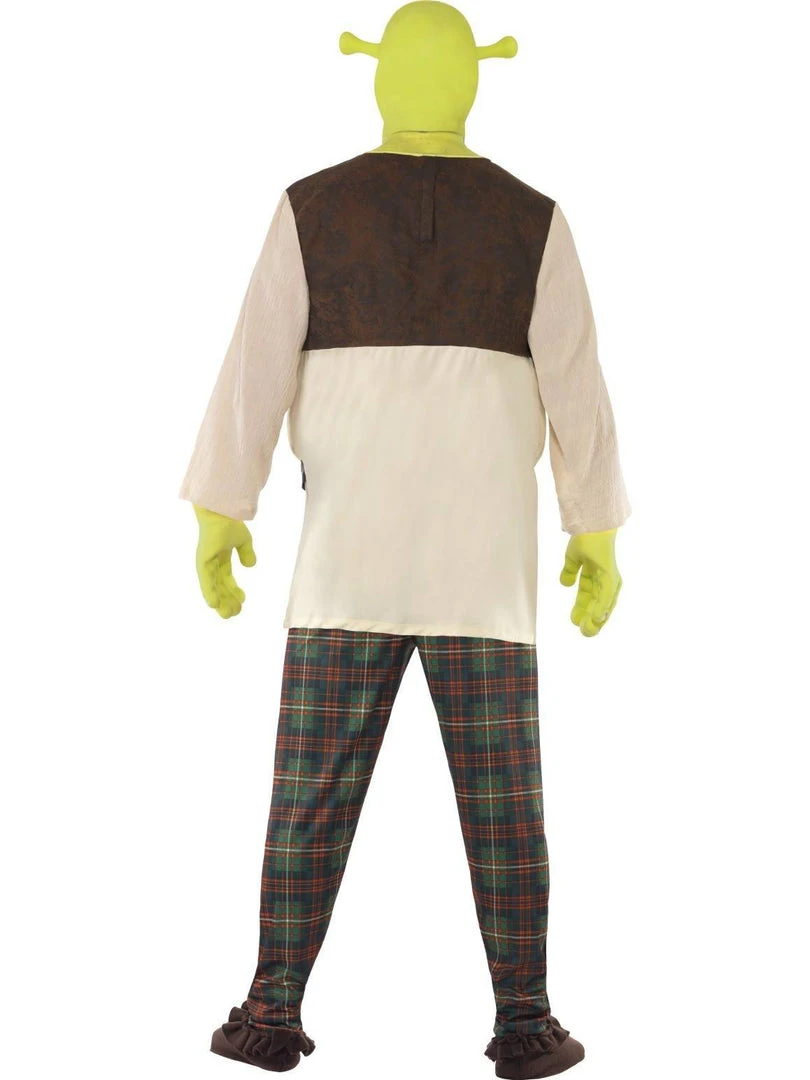 Shrek, the original kids’ character for adults. From Disney Dreamworks comes this much loved grumpy (and misunderstood) giant green ogre. This Shrek costume for adults includes padded top with attached vest and belt, tartan print trousers, gloves and mask. Costume does not include shoe covers like shown in the photos. Green body paint and any other accessories sold separately. This is a fully licensed product.