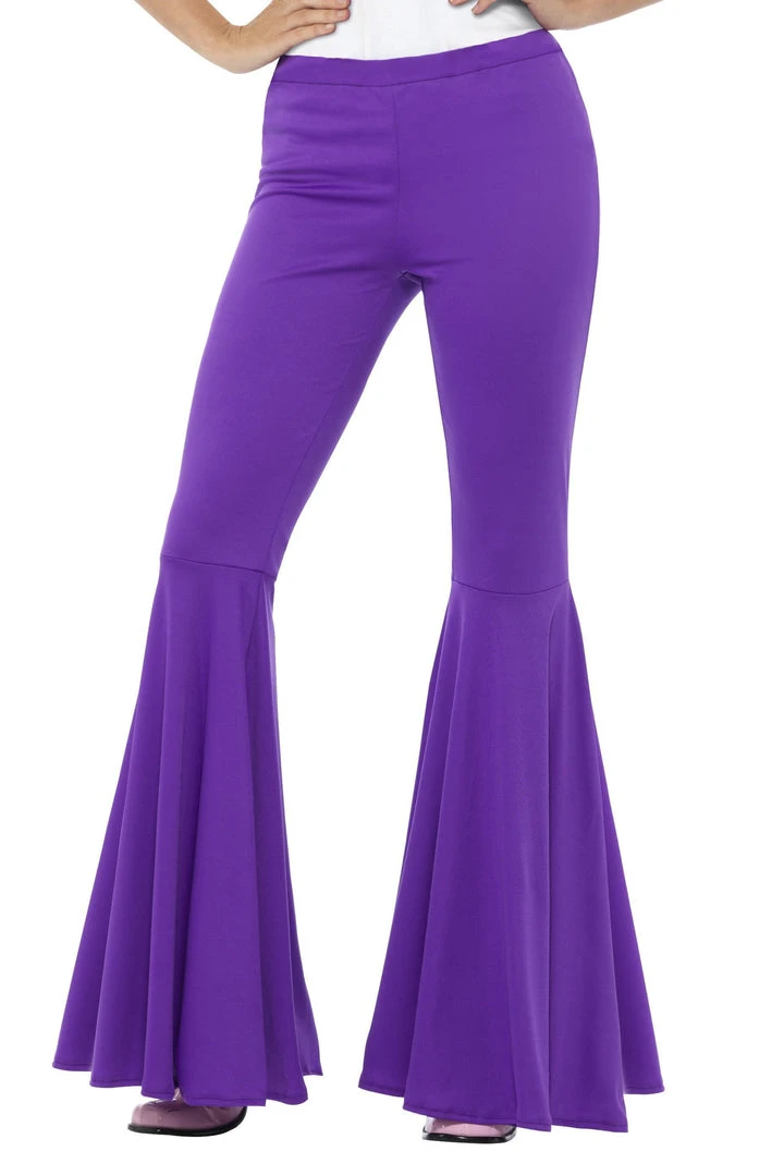 Far out man. Super groovy 60s 70s purple stretch flared trousers for women. No colour says retro like purple. And nothing says hippy like a pair of flares. Packet includes one pair of flares. Match with hippie wig, coloured glasses, peace sign. All those and many other 60s and 70s accessories sold separately here.