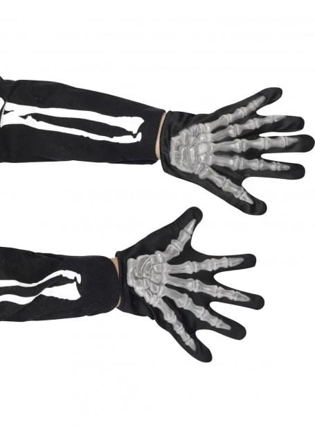 Complete your scary skeleton or Grim Reaper Halloween costume with these kids skeleton gloves.Black stretch gloves with attached plastic bone fingers. One pair of gloves. Also available in adult size.