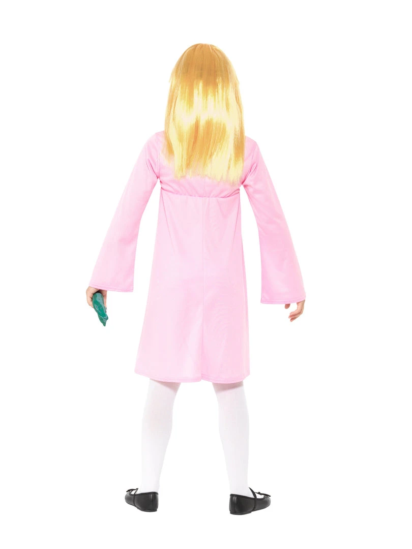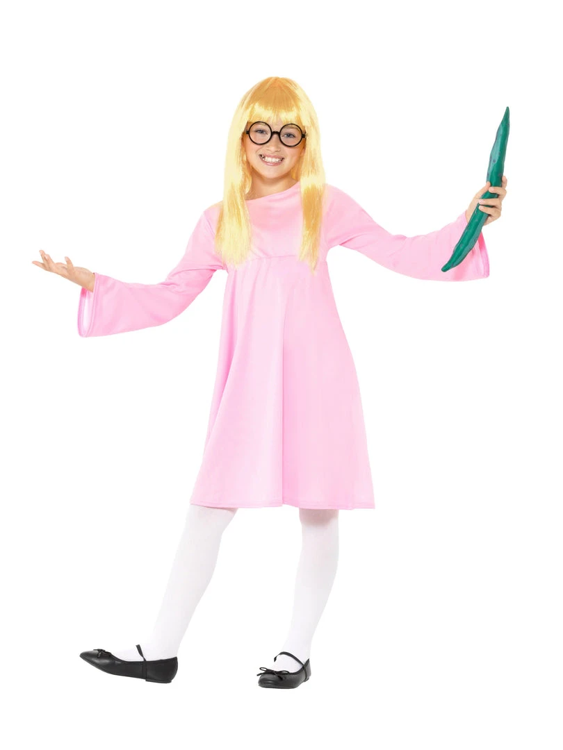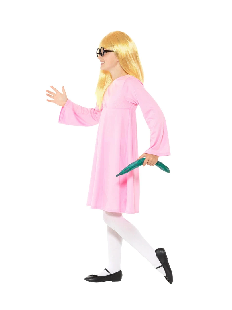 From Roald Dahl’s classic children’s story The BFG comes this Sophie costume for girls. Dress up as orphan girl Sophie who is kidnapped by The BFG and then, when she discovers he is a friendly giant, befriends him and eventually ends up staying in the palace with the Queen! Costume includes pink dress, round glasses frames, long blonde wig and Snozzcumber. White tights and shoes not included. Dress up in this costume for Book Week and Find Your Treasure.