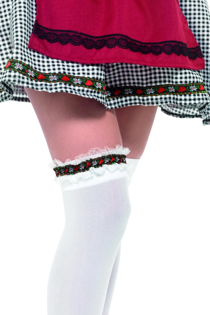The perfect accessory to complete your Oktoberfest Beer Wench costume. Wear it at the top of your over knee socks like in the photo or on bare legs. Stretch garter in rustic Bavarian floral brocade with white lace trim. One garter in package. Hosiery and costume sold separately.Â