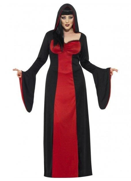 Great Halloween costume for a Vampiress, Witch, She-Devil and any other wicked temptress of the night. Dark Temptress Plus Size costume includes red and black stretch dress and hood. Wig and all other accessories sold separately.