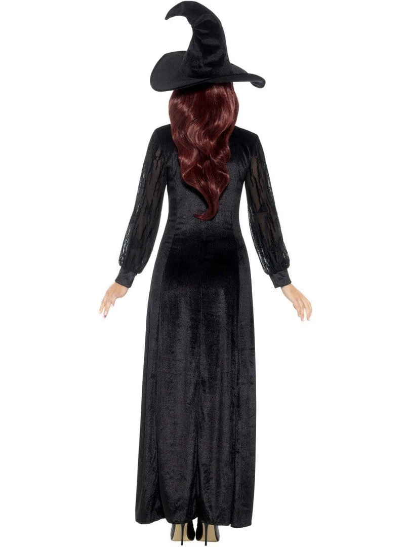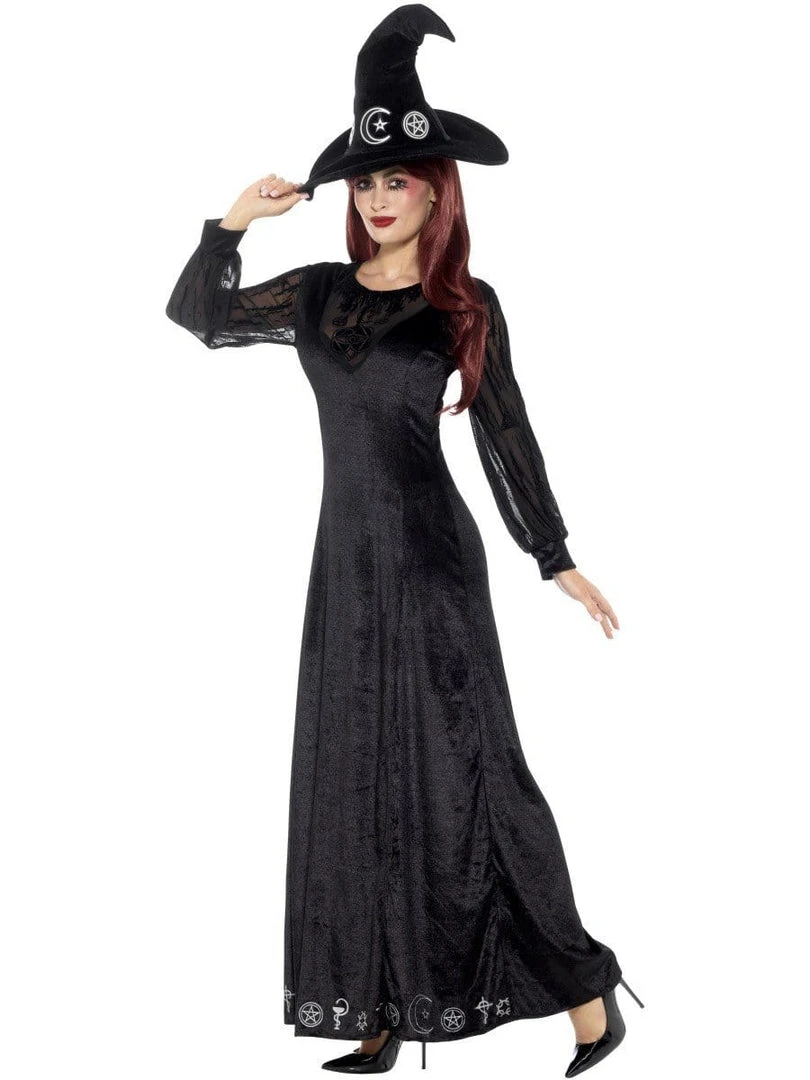 Deluxe Witch Craft Halloween Costume for adults includes soft flowing velveteen gown with sheer deep neckline and long sleeves featuring embossed witchcraft and magical symbols. Comes with matching hat also featuring printed symbols which are also on the hemline of the gently flowing and flattering dress. Wig, broomstick, make-up and all other accessories sold separately. Dress and hat only.