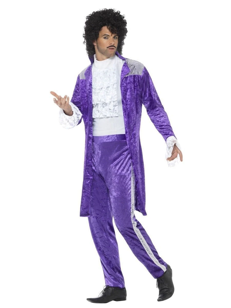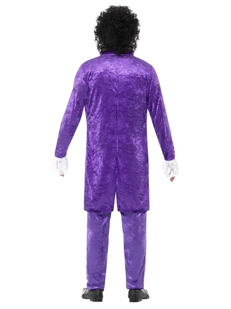 The long sleeve jacket of the Purple Rain Musician Prince costume contrasts well with the white button down shirt underneath. Topped with a black curly wig, this costume depicts an era reminiscent of the good times.