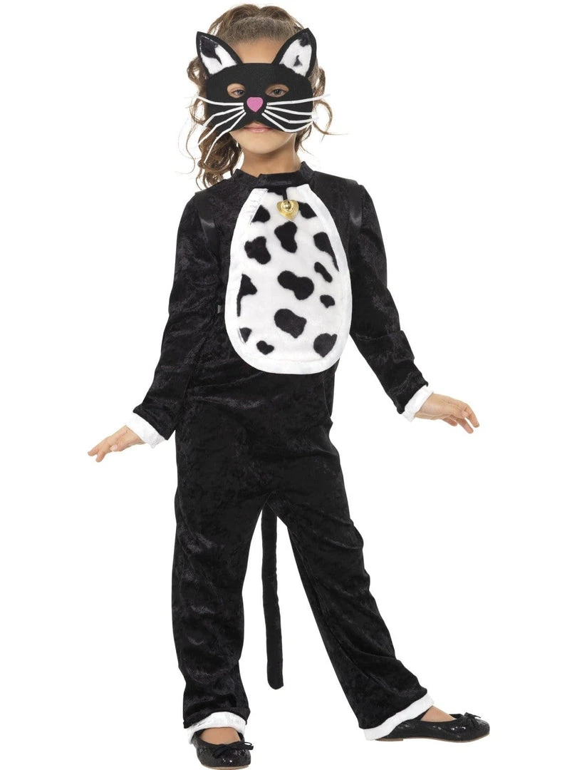 Black and white cat jumpsuit for kids. Adorable costume includes black stretch jumpsuit with spotty chest and kitty bell at neckline, matching mask and detachable tail. Cute for Book Week cat characters and perfect at Halloween.