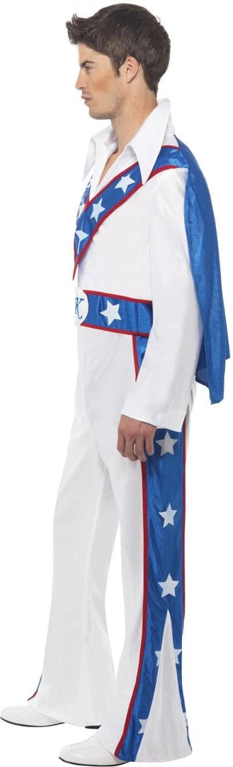 Whether it was jumping a crate of rattlesnakes and two mountain lions, over a row of double decker buses or even the Caesars Palace fountains, during the 1960s and 70s there was only one king of the daredevils and his name was Evil Knievel. For many years the stunt performer brought joy to millions with his fearless attitude and playful antics. Breaking hundreds of daredevil records and setting a new standard for extreme motorcycle riding that hasn’t been matched since. It was often however, with their American colour theme, bright glitter and flared edges, that his Elvis themed overalls that gathered most crowd attention. Dress like your hero in this officially licensed Evil Knievel costume and imagine the adrenaline rush that the death defying motorcycle jumps brought.Â
