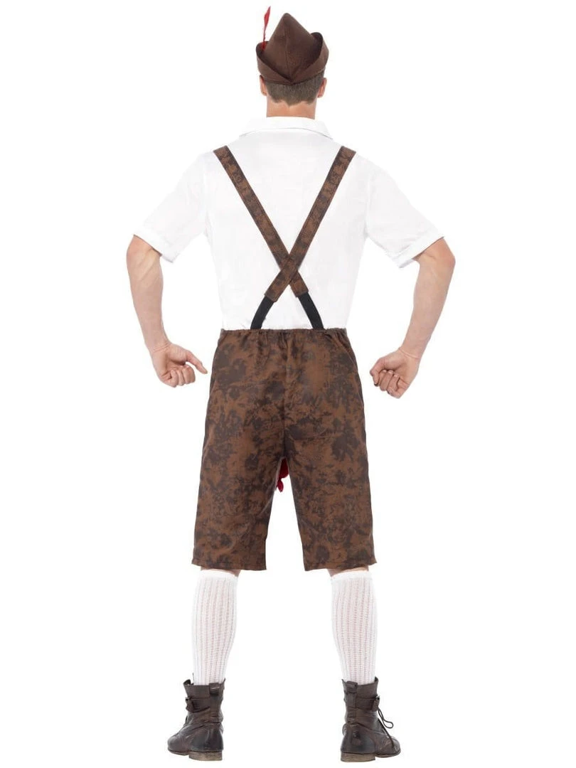 The Adult Oktoberfest Brad Wurst Costume includes a pair of brown lederhosen shorts with printed tankards of beer and an attached red wurst sausage on the crotch. The waistband of the lederhosen is half elasticated at the back to ensure a comfortable fit when wearing. The fancy dress outfit is finished with a white shirt with adjustable ties at the neckline and a coordinating brown Bavarian style hat with an attached red feather on the side.