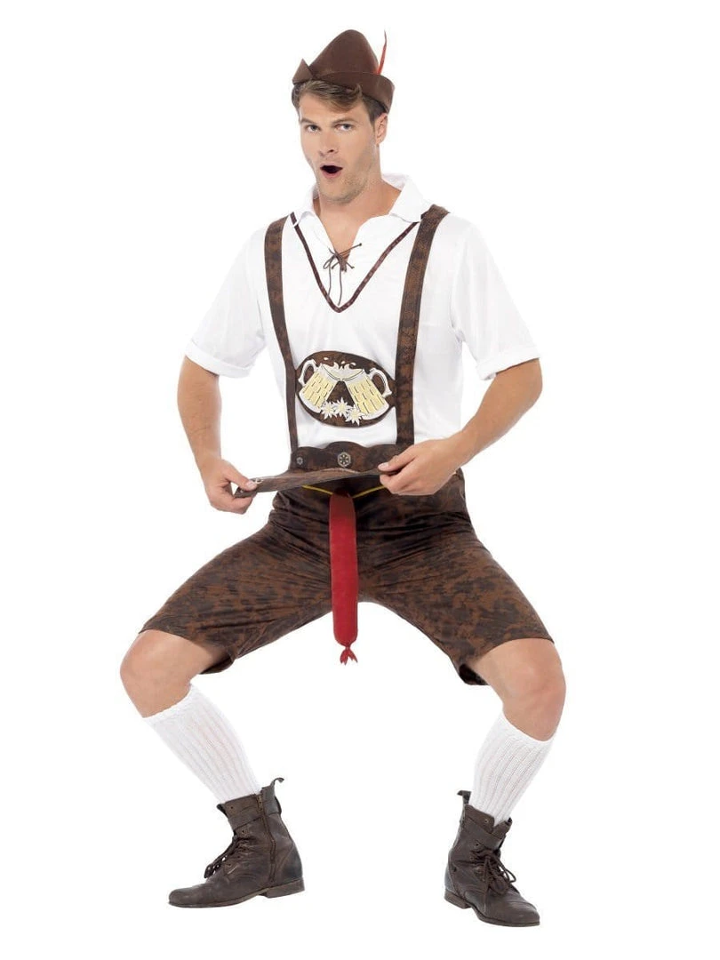 Mens adult Brad Wurst costume includes a pair of Lederhosen with attached red wurst sausage, White Shirt and Hat.