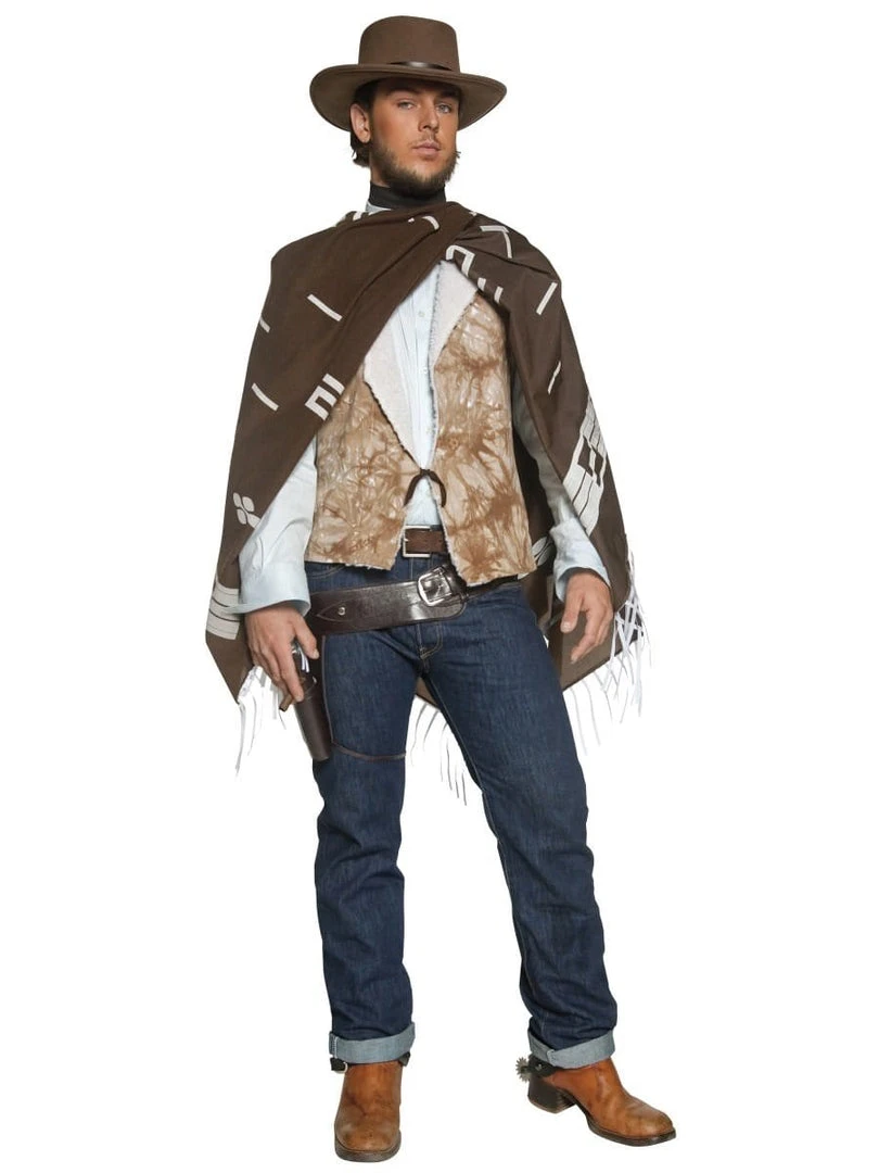 Walk the walk at your next Western event in our Clint Eastwood inspired Spaghetti Western Costume from the classic 1964 movie A Fistful of Dollars. The costume includes the Poncho, Vest with Faux Shirt and Neck scarf.