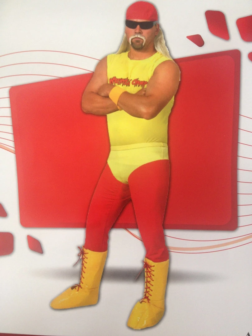 Yellow and red Hulk Hogan Wrestler costume includes: