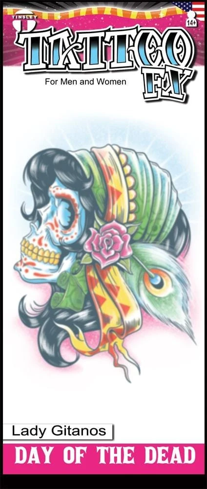 Day of the Dead Lady Gitanos Temporary Tattoo. Complete your Mexican costume with this great tattoo. Size 9x14cm