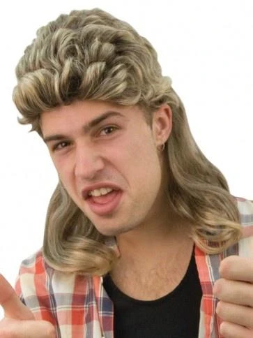 Brown 80’s men mullet costume rockstar wig. Wig may require additional styling to achieve the desired look. If required use hairspray to hold desired style.