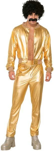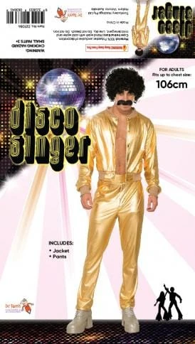 Get down and boogie in this jive talkin’ Gold Disco Singer 70’s Costume. Slay ’em on the dance floor in this two piece tracksuit style costume for men which includes gold jacket and matching gold pants. Complete your stellar 1970s costume with afro wig, handlebar moustache, bling and big old rug of chest hair. Click here for matching Men’s 70’s Disco Hair Set.
