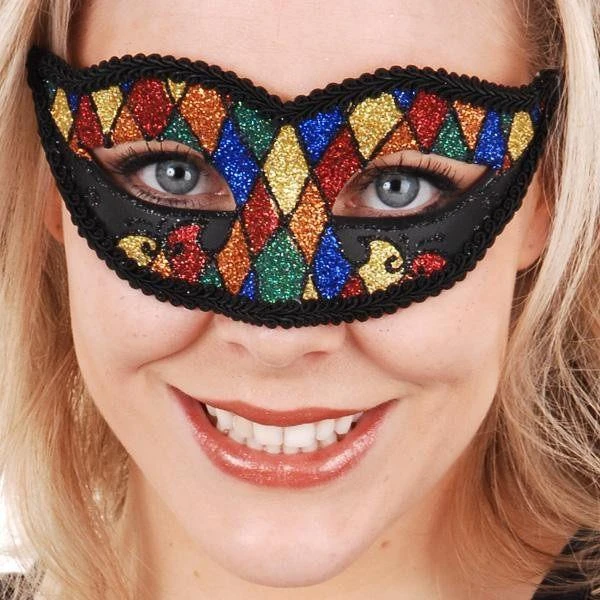 Harlequin Glitter venetian Style masquerade mask with tie up ribbon in bright multicolour.
