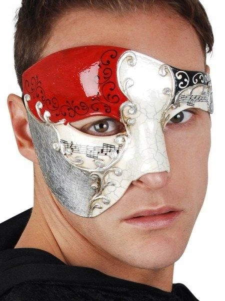 Half face masquerade mask in silver, black, red as and musical notation.
