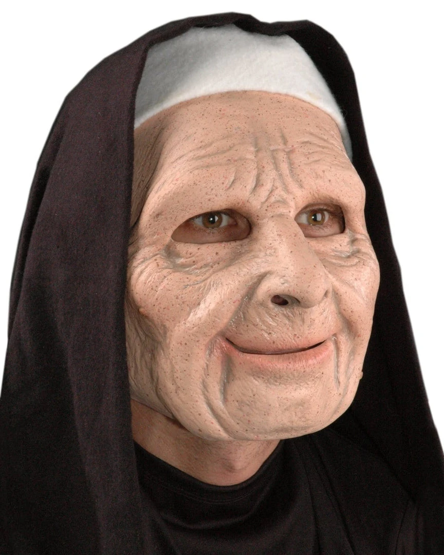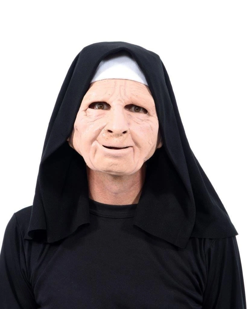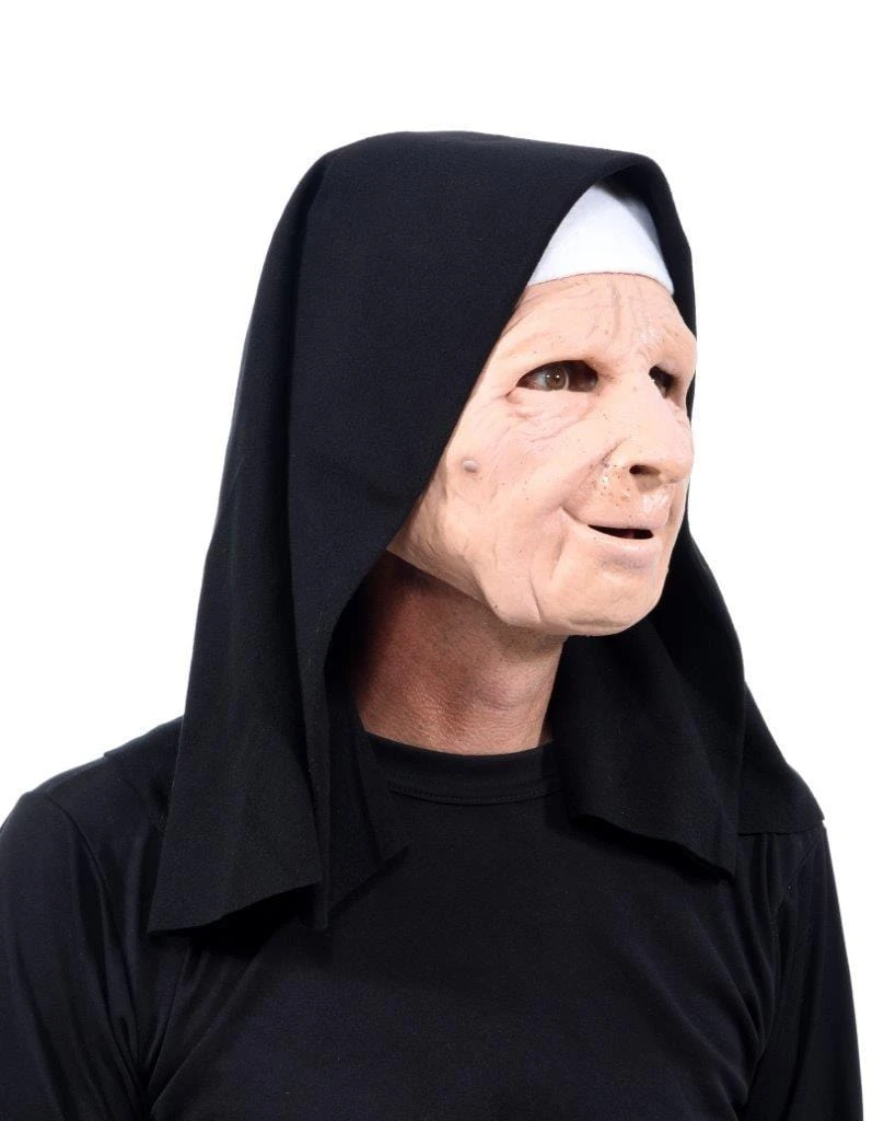 Fabulous freaky and funny latex mask. This mask was selected for use in the 2010 Motion Picture The Town. Unlike many masks Zagone brand masks are specially designed to be very comfortable to wear all night long.Old Lady Nun Mask Full over-the-head mask. She is also known as Nun on the Run.