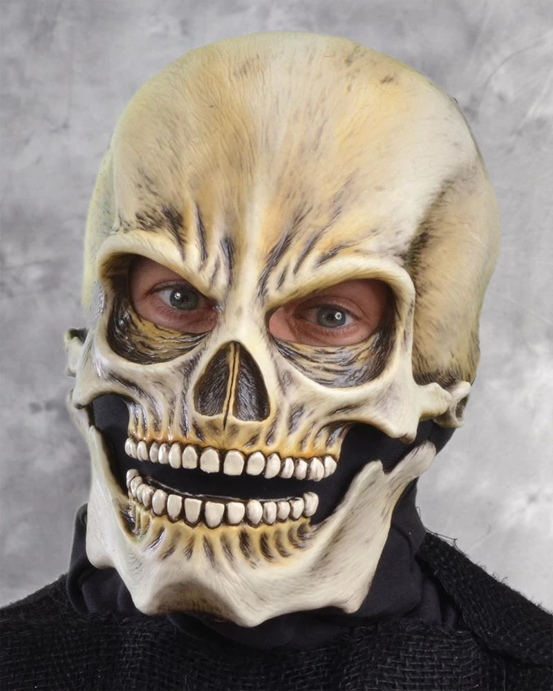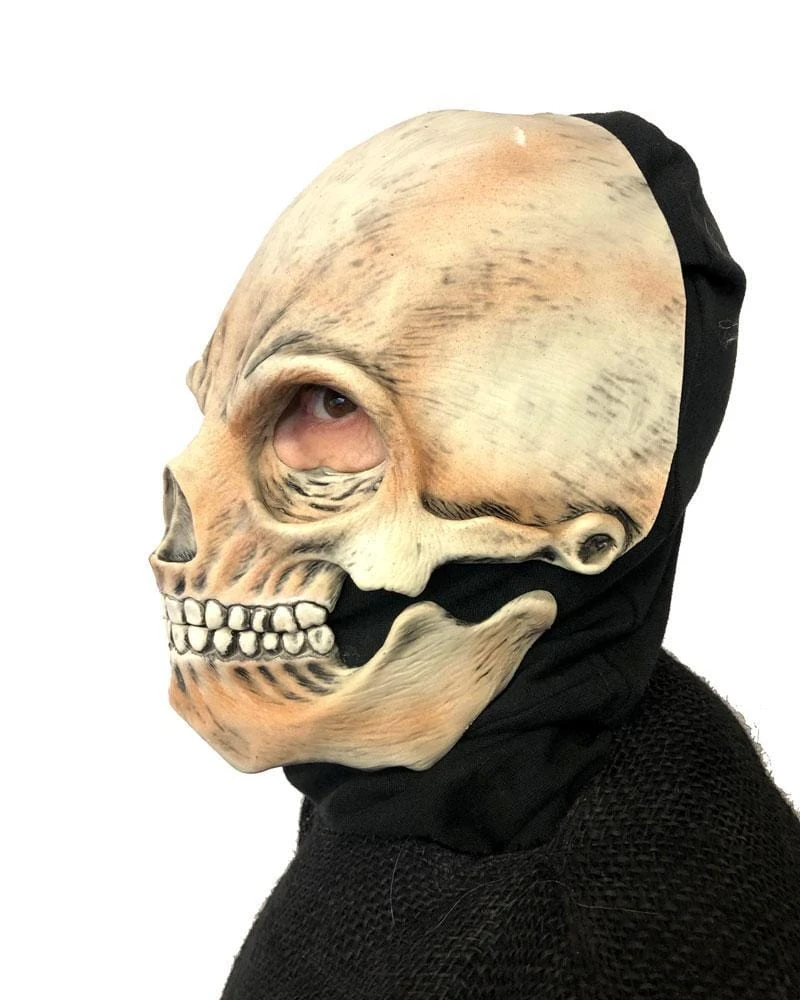 Moving mouth sock mask of a traditional skull or grim reaper character. Bring the dead to life sculpt showing great detail and allowing for great movement. The sock mask design with the latex sitting on top of the sock allows the actor the capacity to make the mask move simply by making facial expressions. The sock acts a buffer for the actors skin to the latex adding to the comfort. Very comfortable to wear with excellent visibility. Perfect as a decoration for haunted mazes. Perfect for any Grim Reaper, Death or Skeleton Cosplay Character!